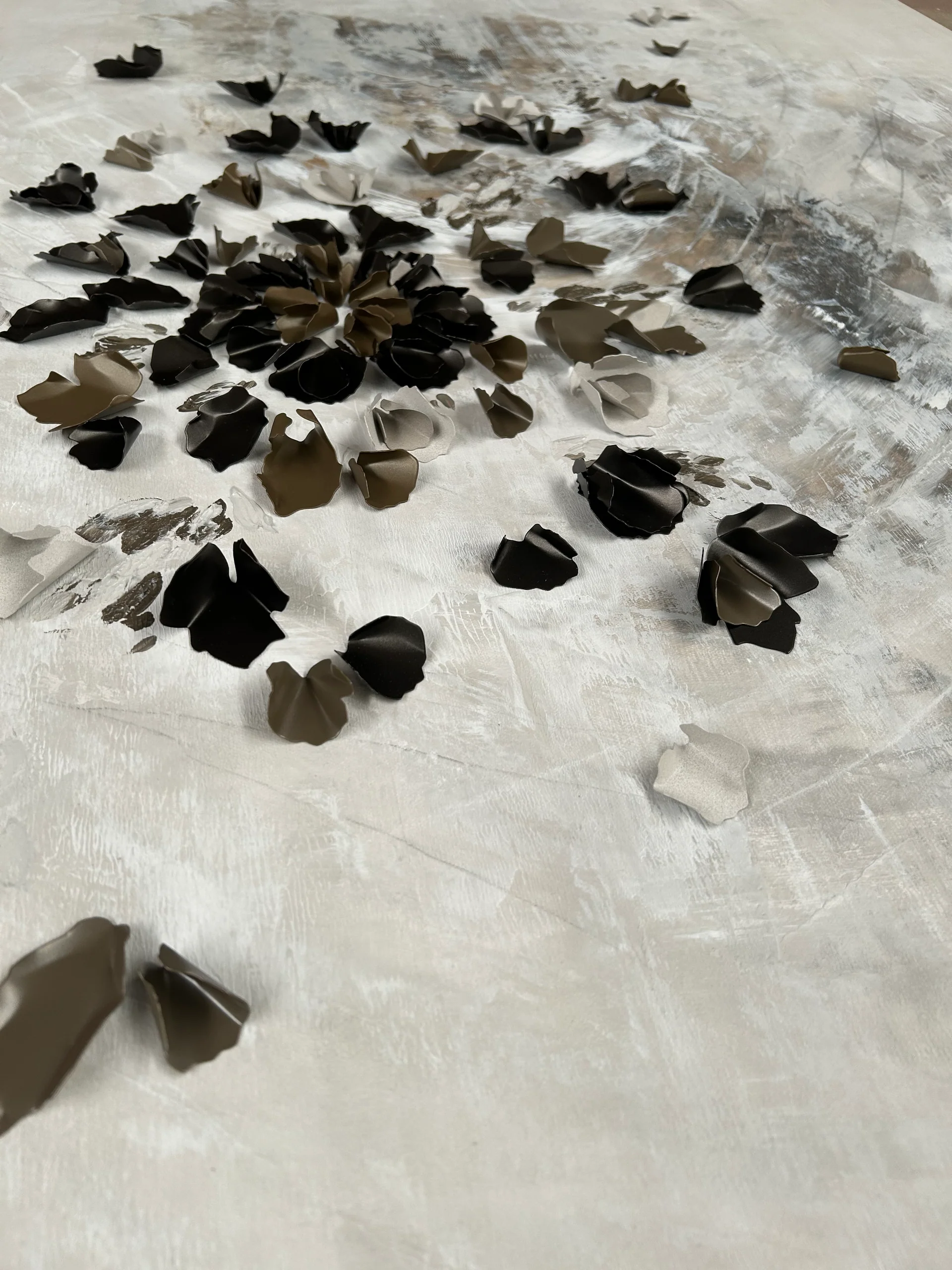 | Medium | Original canvas, acrylic artwork with coated, laser cut metal fragments. The shapes of the fragments are created using natural leaf and petal shapes, alongside the outline of Spain on the map, as this piece was created for our Marbella Exhibition. The Fragments are positioned to burst out of the canvas, replication a carnation flower; with a mixture of bronze coated Fragments spilling out onto the canvas and completing the many layers of texture, built in beautiful tones of taupe, beige, bronzes and browns. |